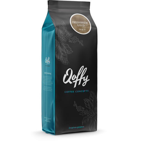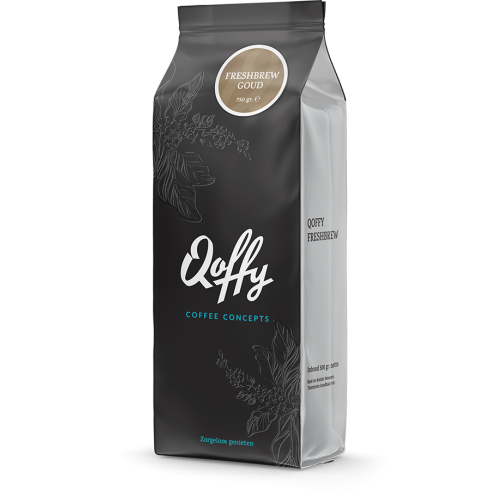 De basis voor deze Qoffy Freshbrew Goud is de Qoffy Goudboon. Een krachtige koffieboon bestaande uit 80% Arabica en 20% Robusta. Het hoge percentage Arabica maakt van deze koffie een perfecte doordrinkkoffie voor de gehele dag. Zeer goed te gebruiken voor een volle espresso of ristretto, maar ook goed te gebruiken voor cappuccino of latte macchiato.