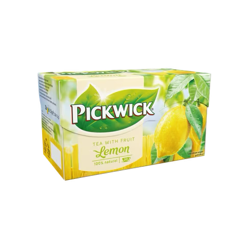 Pickwick Lemon, verpakt per 4 doosjes à 20 zakjes van 2 gram in een omdoos.